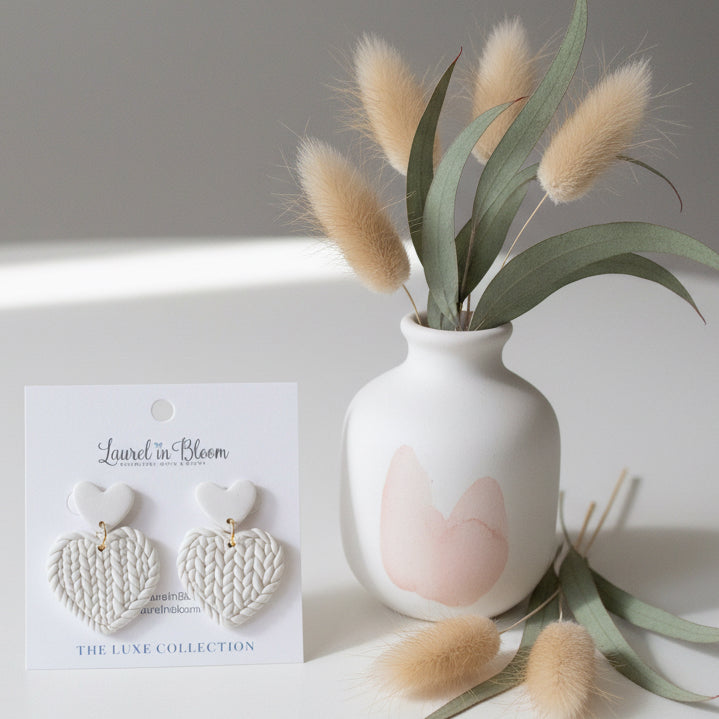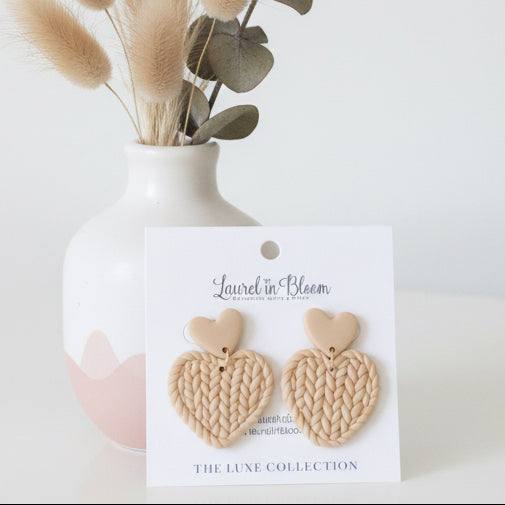 Delicate and woven clay hearts suspended from graceful heart studs create an understated elegance perfect for any occasion. Available in soft white and warm taupe, these boho-inspired earrings blend artisanal charm with refined simplicity. The lightweight design ensures all-day comfort, while the soft, organic aesthetic adds a touch of bohemian sophistication to both casual and dressed-up looks. A versatile pair that whispers rather than shouts.