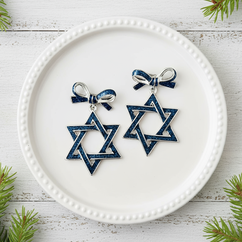 Elevate your seasonal look with our Magen Bows earrings, featuring a timeless Star of David drop paired with a chic bow stud. These earrings blend classic symbolism with contemporary design, offering a refined accessory that adds both elegance and modern sophistication to any ensemble. Perfect for those who appreciate meaningful style with a modern, fashionable look.