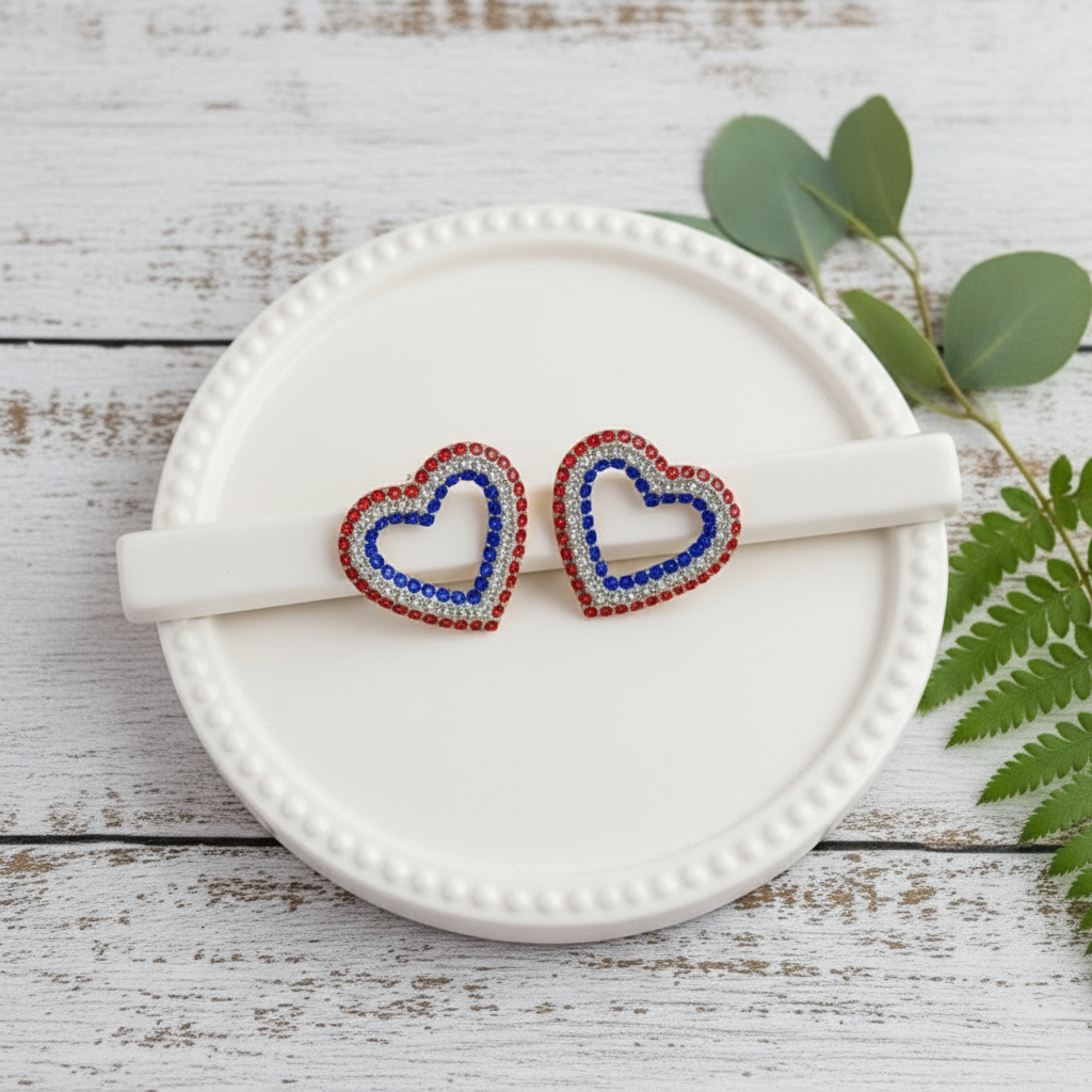 These exquisite channel-set Patriot Love earrings feature striking red, white, and blue hearts, elegantly expressing patriotic pride. Their generous size ensures they command attention, making them a refined statement piece for any occasion. Perfect for showcasing your love of country with subtle sophistication.