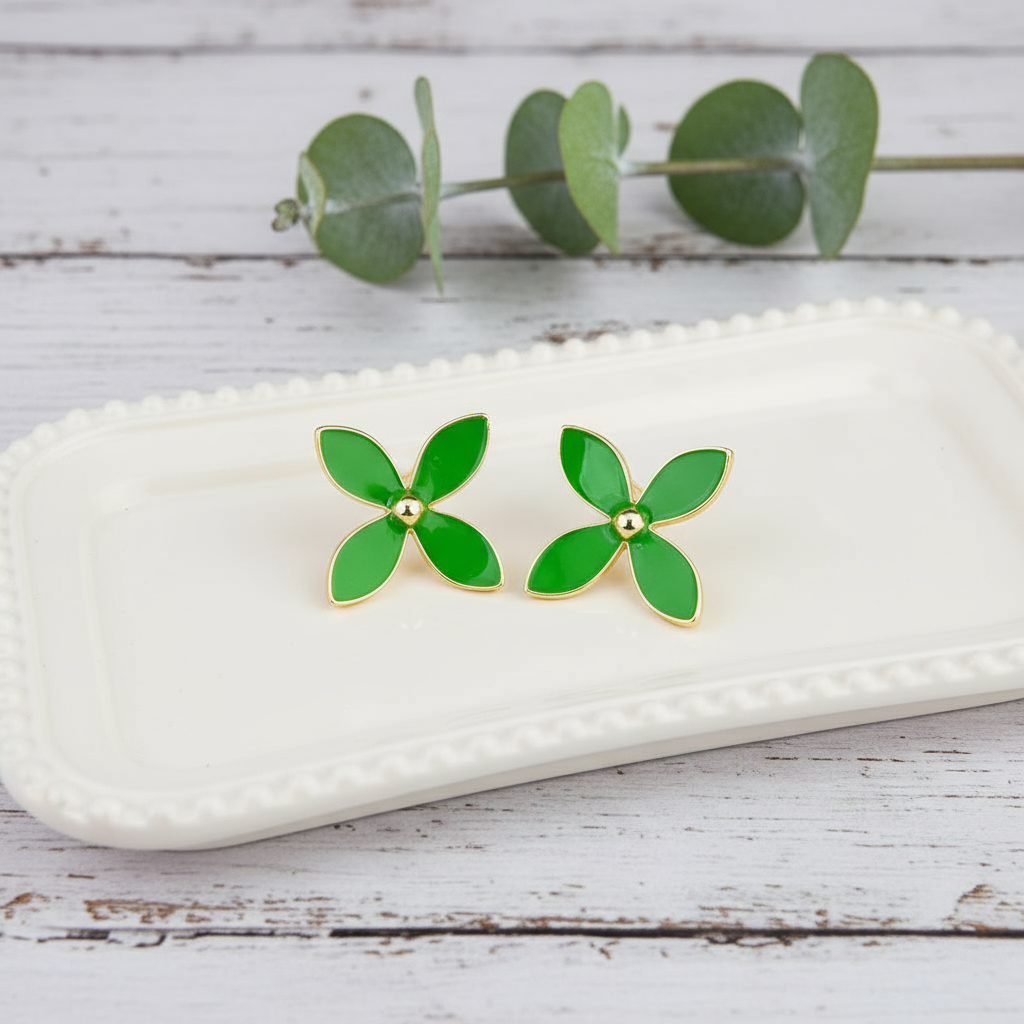 Our elegant Quatre Flora earrings feature a simple but refined gold rimmed enamel four-petal flower available in a selection of sophisticated colors. These earrings offer a subtle yet striking accent, perfect for adding a polished touch to any ensemble. Offered in White, Mint, Coral and Green.