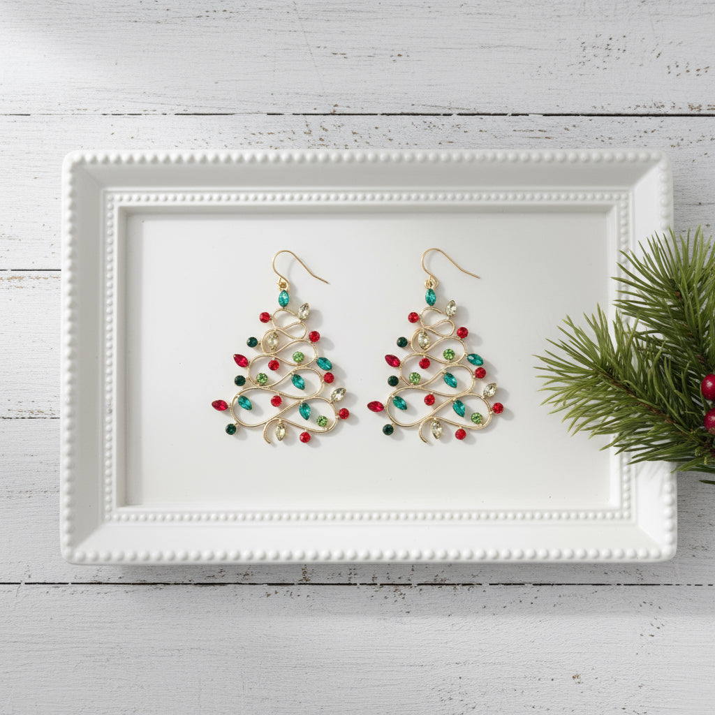 Top off your holiday ensemble with these exquisite Retro Tinsel Tree Earrings, featuring delicate wirework shaped into charming Christmas trees adorned with vintage-style lights. Available in elegant red and green or vibrant fuchsia and pink, these earrings add a refined sparkle to any festive occasion. Perfect for bringing subtle yet sophisticated holiday cheer to your look.