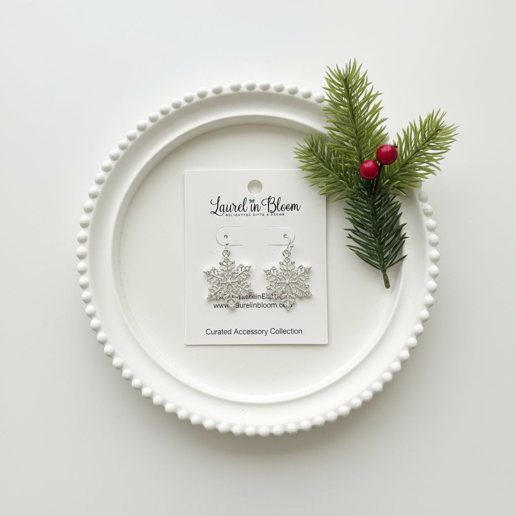 Crafted with sterling silver plating, our Silver Snow earrings showcase delicate snowflake dangles embellished with sparkling crystals. Their refined design offers a subtle shimmer that complements sophisticated styles, making them an exquisite choice for adding a touch of winter elegance to any outfit.